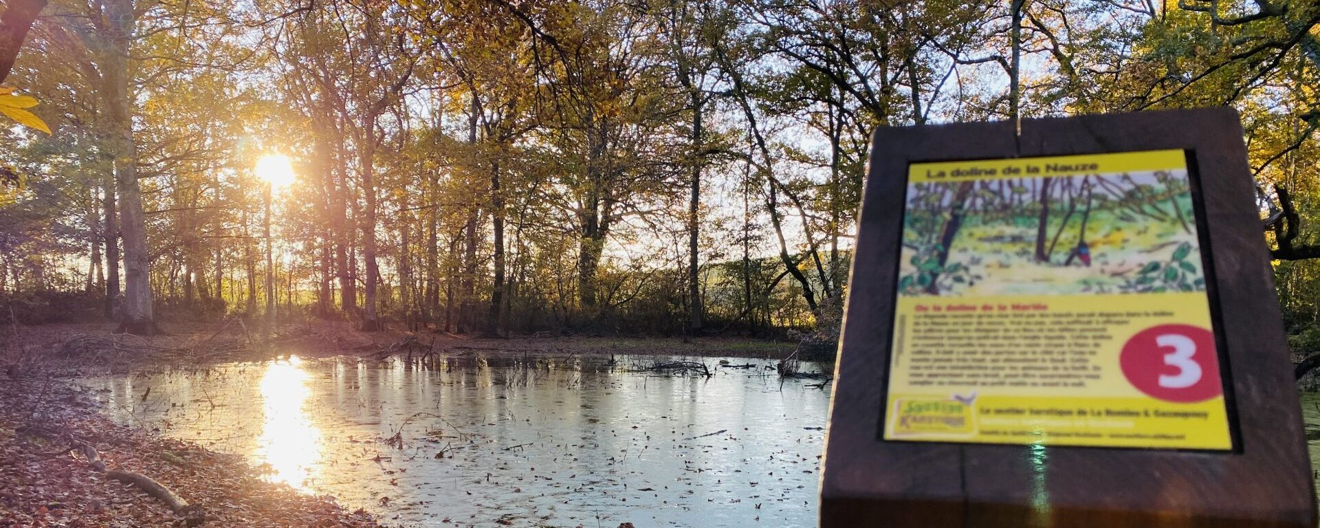 Bien malin qui pourrait s’écrier en arrivant sur le plateau calcaire de La Romieu : « Ah ! Quel beau karst… » Et pourtant, ici, comme sur tous les karsts, les rivières sont invisibles ; elles circulent dans des réseaux souterrains que les spéléologues locaux explorent inlassablement depuis les années 50. Au fil de ce sentier karstique, vous allez découvrir des sources qui n’en sont pas, l’entrée minuscule de la seconde grotte la plus longue du département, vous verrez des dolines, un gouffre, un bout de lapiaz. Bref, vous allez remonter le chemin des eaux souterraines sans mettre les pieds sous terre. Bienvenue sur le sentier karstique de La Romieu et Gazaupouy…