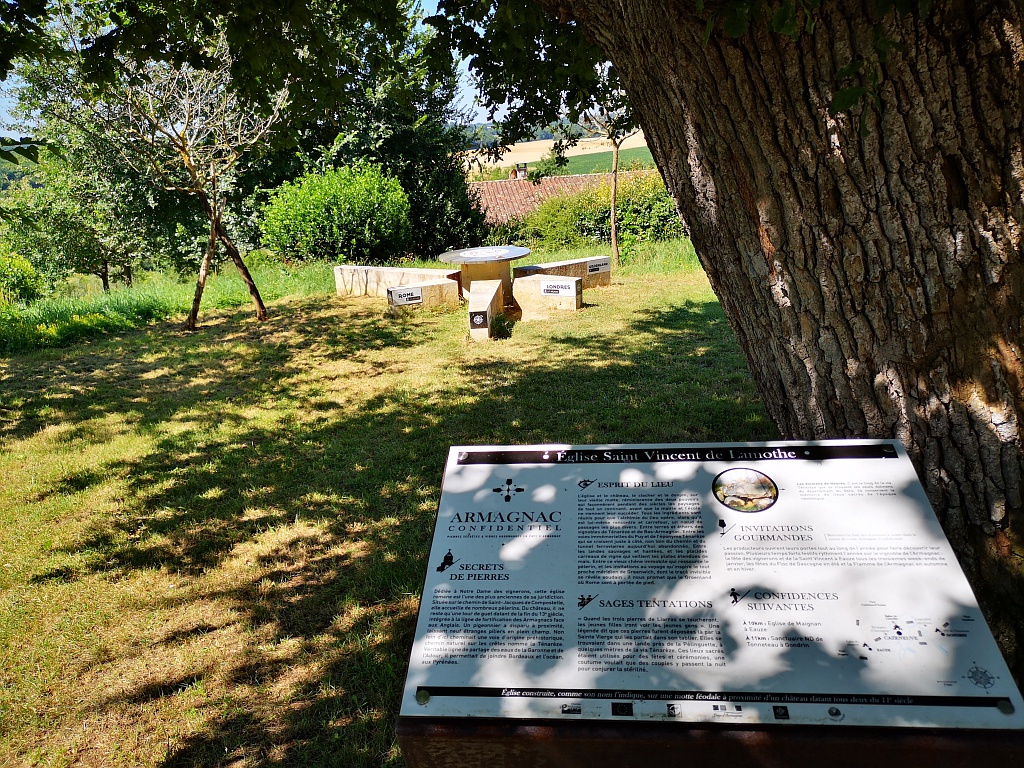 « L’église et le château, le clocher et le donjon, sur leur vieille motte, réminiscence des deux pouvoirs qui façonnèrent pendant des siècles les paysages de tout un continent, avant que la mairie et l’école ne viennent leur succéder. Tous les ingrédients sont réunis pour que l’alchimie du lieu opère, alors qu’il est lui-même rencontre et carrefour, un n½ud de passages les plus divers. Entre terres et éthers des vignobles de Ténarèze et de Bas-Armagnac. Entre les voies immémorielles du Puy et de l’éponyme Ténarèze qui se croisent juste à côté, non loin du chemin et du tunnel ferroviaires aujourd’hui abandonnés. Entre les landes sauvages et hantées, et les placides carreaux de vigne qui veillent les plates étendues de maïs. Entre ce vieux chêne immobile qui ressource le pèlerin, et les invitations au voyage qu’inspire le tout proche méridien de Greenwich, dont le tracé invisible se révèle soudain ; il nous promet que le Groenland ou Rome sont à portée de pied. » - Bruno SIRVEN, Arbre & Paysage 32.