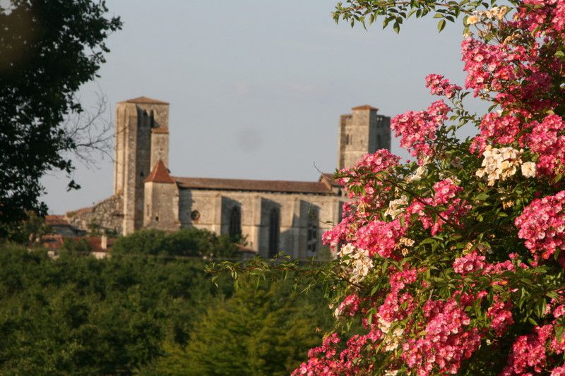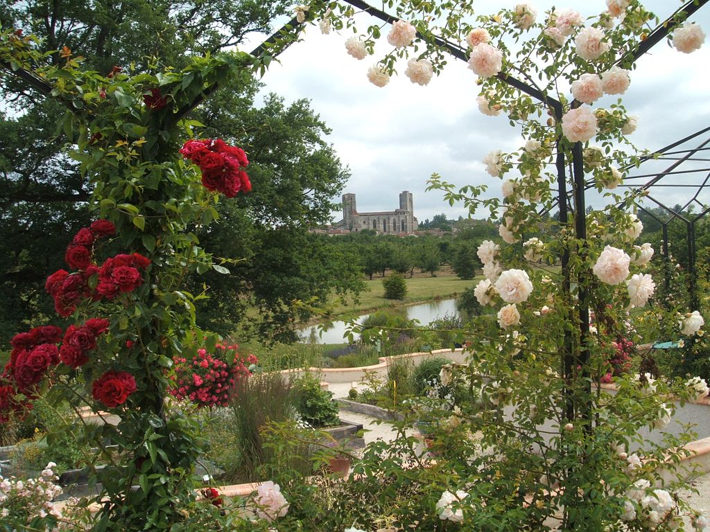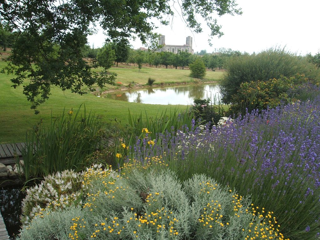 C'est en Gascogne, sur l'un des chemins gersois de St Jacques de Compostelle, que s'étendent les 6 ha des Jardins de Coursiana (Jardin Remarquable), face à la Collégiale de la Romieu qui s'affiche ici en panorama grandeur nature.
