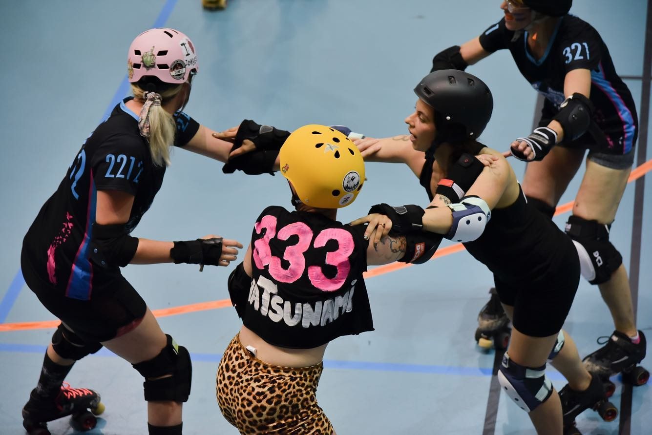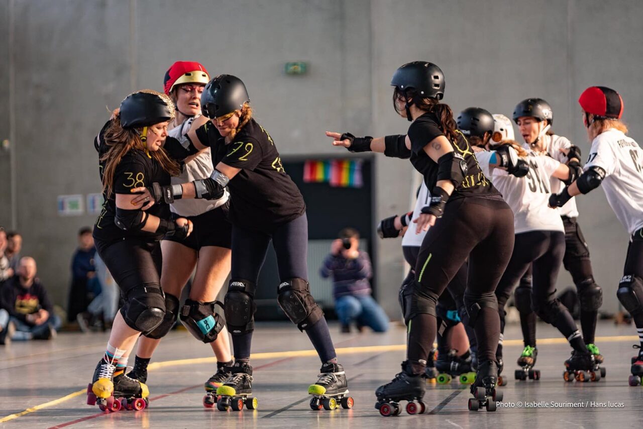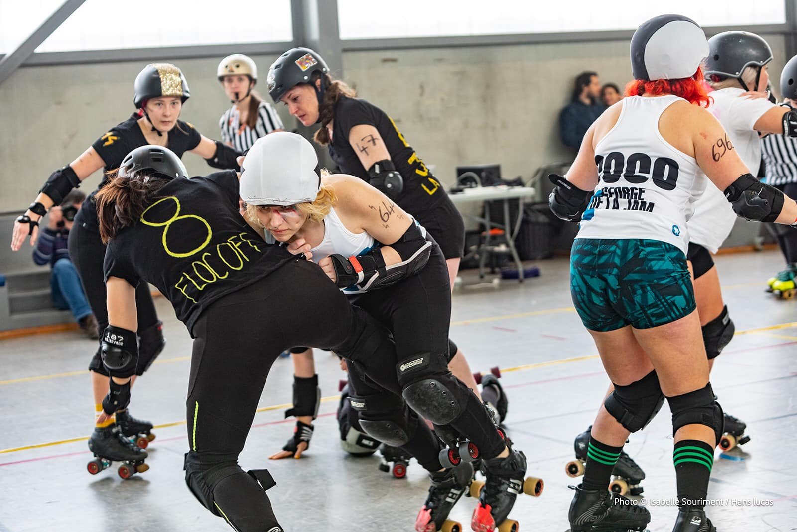Marine : Héhé… Pour revenir à la pratique pure du sport. En résumant à la machette, chaque équipe est composées de 15 joueuses, 5 étant sur le terrain, les autres prêtes à apporter de la fraicheur ! Les deux formations sont ensemble sur le même espace : une piste elliptique inclue sur la superficie d’un terrain de handball. Une jameuse (1 par équipe) va tenter de franchir les 4 bloqueuses adverses, et vive-versa pour l’autre équipe. Les quads outils indispensables de ce sport, emmènent vitesse, intensité et contact d’autant plus spectaculaires ! Enfin un climat bienveillant est au cœur de la création du sport, en témoigne la présence de nombreux.euses arbitres, supérieur.e.s en nombre à l’ensemble des joueuses.