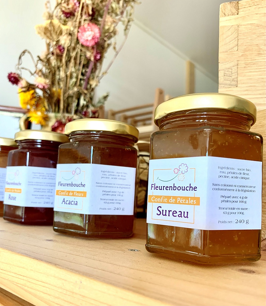 Produits : confits (en pots de 50 gr ou 240 gr)- 30 variétés au choix: acacia, achillée, aubépine, bleuet, capucine, coquelicot, hibiscus, marjolaine, jasmin, lavande, mauve, mélilot, mimosa, monarde, oeillet, rose, sureau, tilleul, angélique, anis, armoise, basilic, coriandre, eucalyptus, mélisse, menthe, romarin, sauge, thym. Gelées. Sirops de fleurs (en bouteilles de 0.26 litres) - 5 variétés au choix: coquelicot, hibiscus, lavande, rose, sureau. Sorbets (en boules sur cornets gaufrés ou au litre) - 13 variétés ou plus selon les saisons: acacia, coquelicot, hibiscus, lavande, mimosa, oeillet, rose, sureau, angélique, anis, basilic, menthe, verveine,....