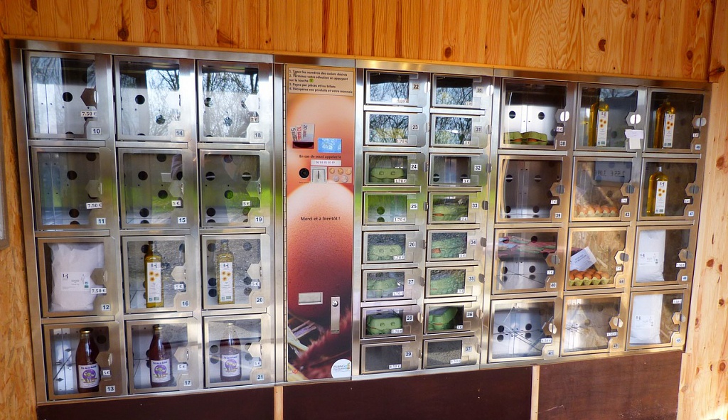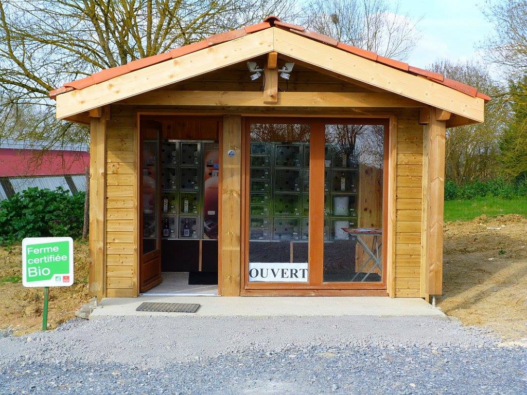 Grâce à notre distributeur automatique ouvert 24H/24 et 7J/7, nous vous offrons la possibilité de venir chercher à toute heure des oeufs, fruits de saison, huile de tournesol, farine de blé, jus de fruits, confitures, courges 100% bio issus de nos productions ainsi qu'une sélection de miels.