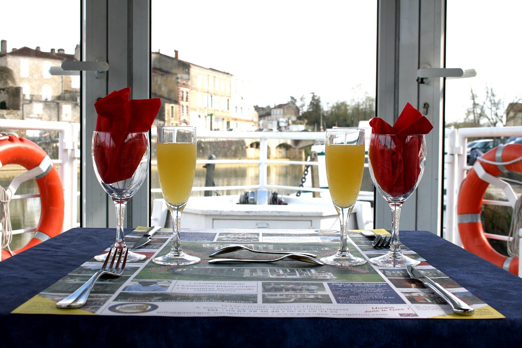 Le bateau "Le d'Artagnan" vous accueille sur la charmante rivière Baïse, à Condom, pour une pause conviviale et gasconne, lors d'une croisière apéritif.