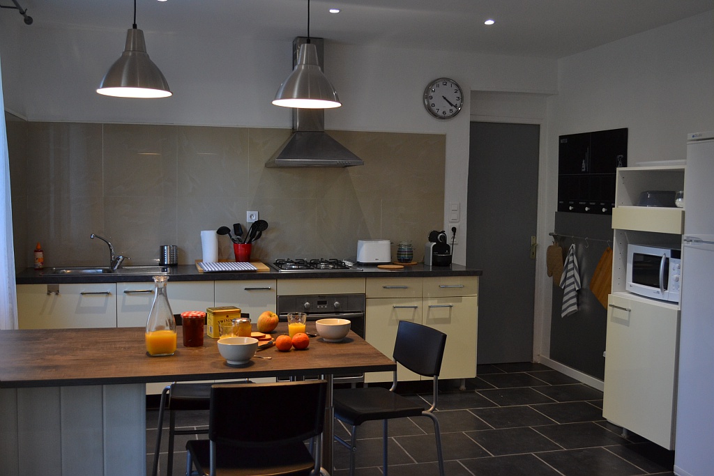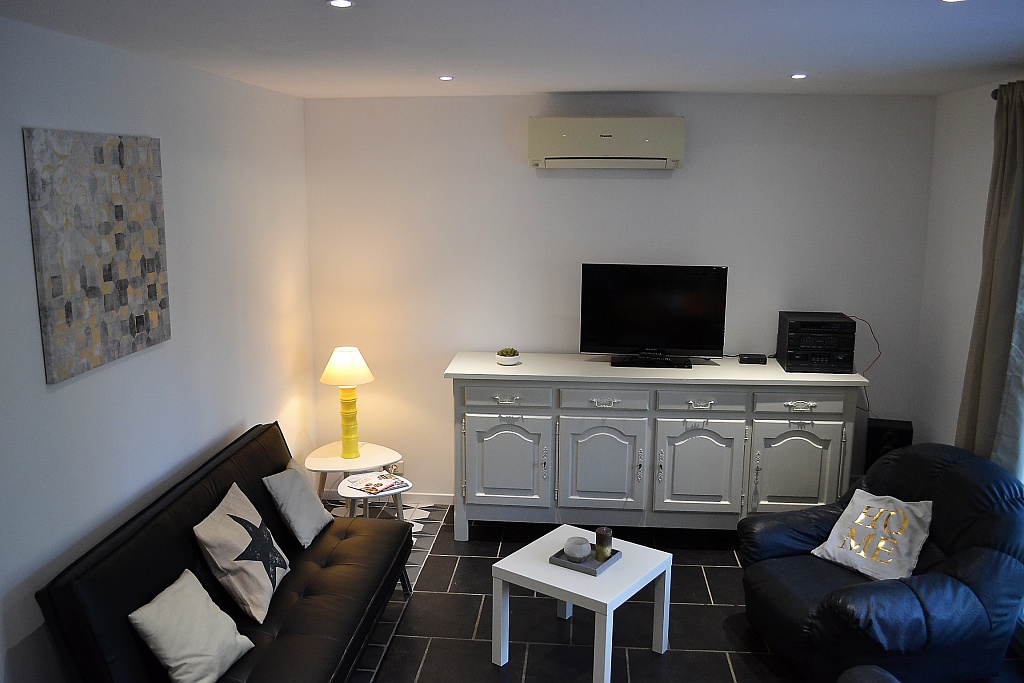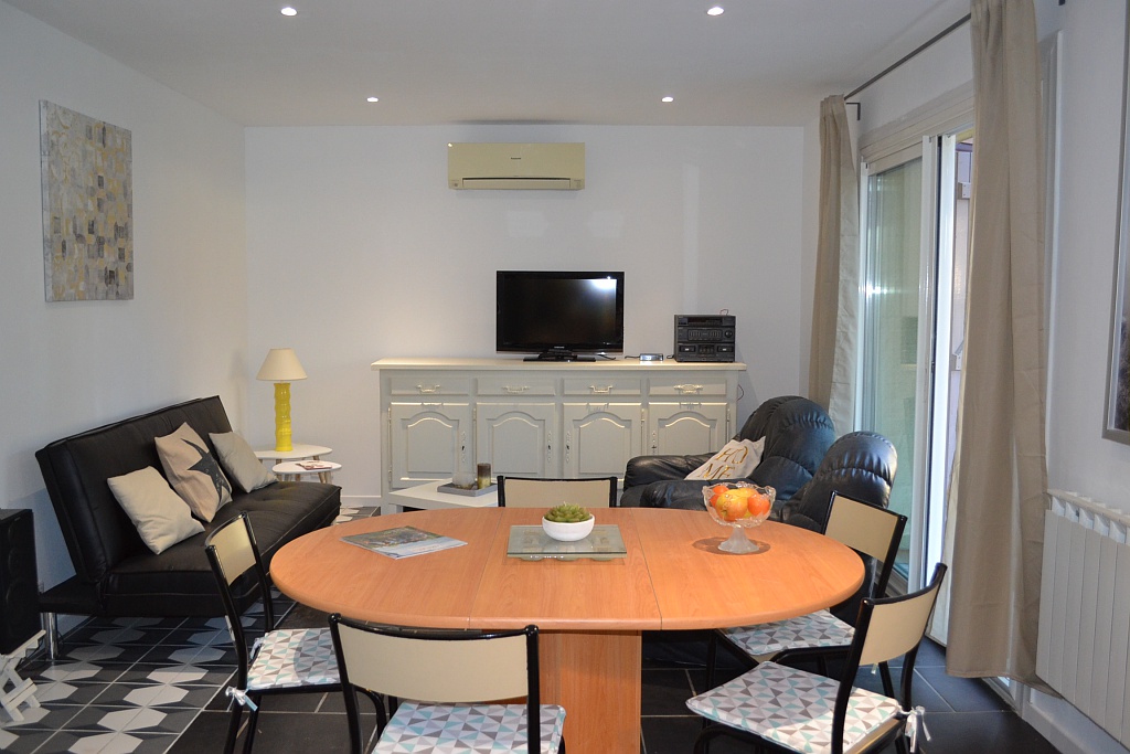Retrouvez une grande pièce à vivre avec salon, salle à manger et cuisine ouverte toute équipée : lave-vaisselle, lave-linge, four, micro-ondes, climatisation...