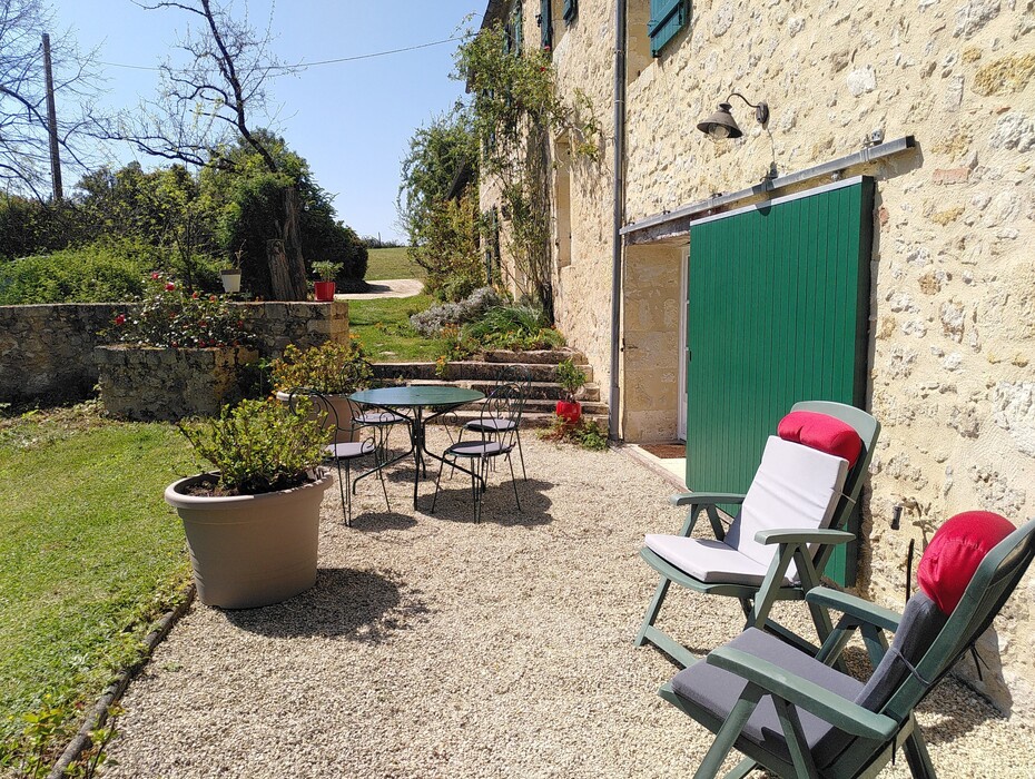 La terrasse est à votre disposition avec un salon de jardin, des bains de soleil, la mare est à proximité.