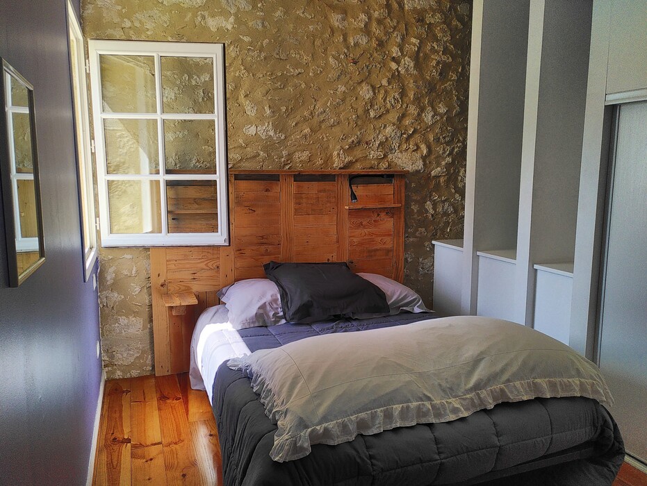 Au rez-de-chaussée de la chambre principale se trouve la salle de séjour avec un canapé méridienne 90x190, une table bistrot et un placard. La chambre est en mezzanine avec un lit 140x190 et un placard.