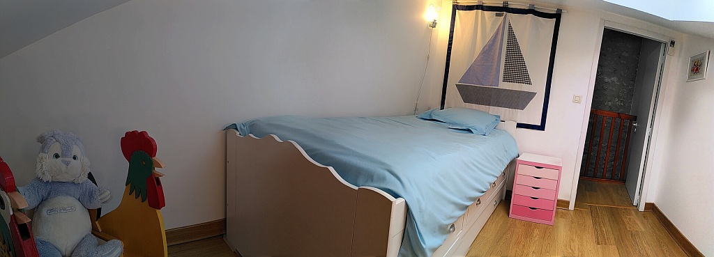La deuxième chambre à l'étage est mansardée et dispose d'un lit 90x190 avec un lit-tiroir pour accueillir un ou deux enfants.