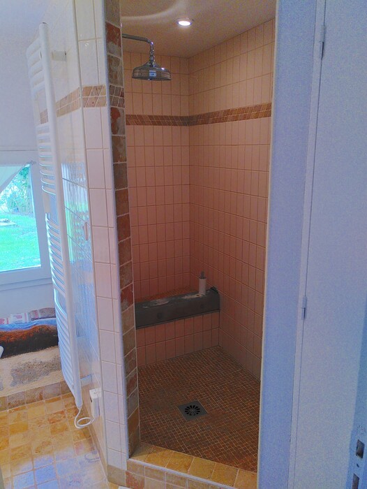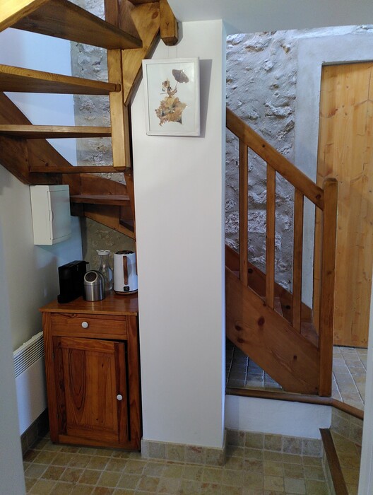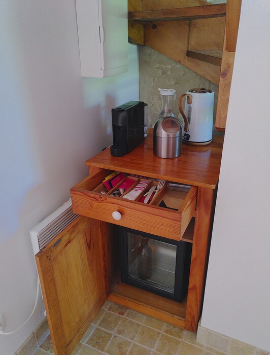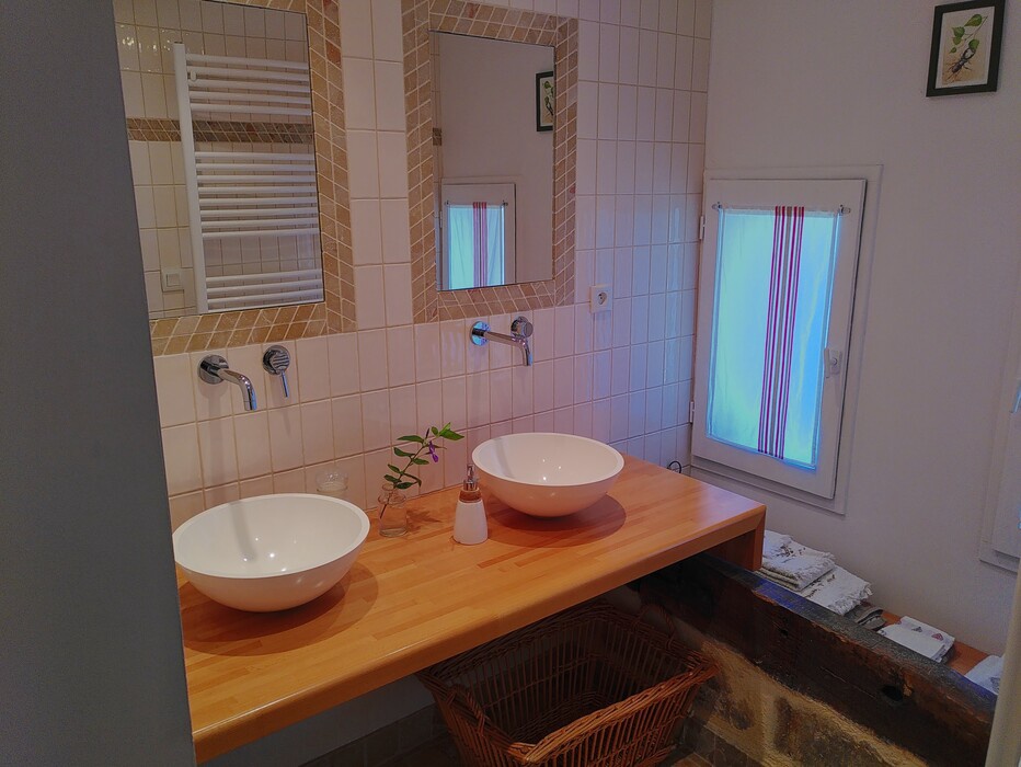 La salle d'eau (douche à l'italienne, double vasque, sèche-serviette) et le wc indépendant sont au rez-de-chaussée. ainsi qu'un coin bouilloire, machine à café et un frigo mini-bar.