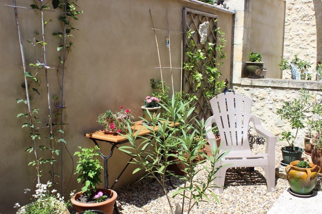 Le portail franchi, vous pénétrez dans le patio ensoleillé et fleuri dont vous pourrez profiter.