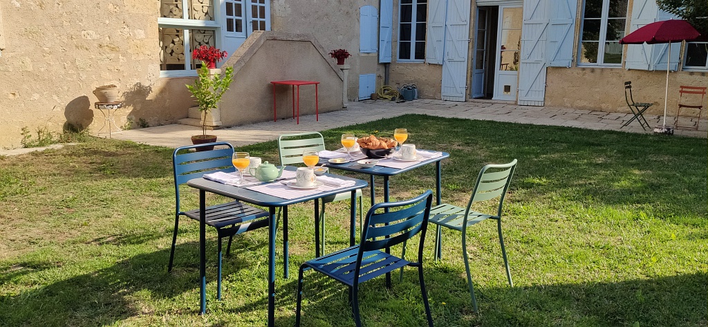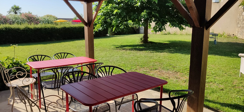 Une cuisine d'été sera aménagée pour l'été dans le jardin, avec table, chaises, vaisselle, réfrigérateur et plaque de cuisson.